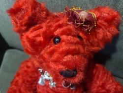 Bonjour, Je m'appelle Carmen. Je suis une belle ourse de 36 cm. Je suis réalisée en fausse fourrure rouge façon astrakan. Mes pattes sont en suédine. Je porte un très joli noeud dans les cheveux et un collier.