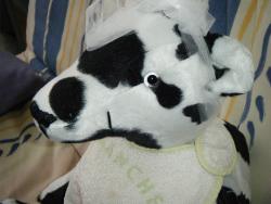 Bonjour, je m'appelle Samba, c'est moi l'ourse en peau de vache, synthétique, bien sûr...Mes papattes sont en simili cuir, j'ai de grands yeux transparents et j'ai mis mon bavoir car je ne mange pas encore très proprement même si je suis grande en taille: 51 cm.