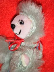 Je m'appelle Inuit, je suis un gentil ours de 12 cm réalisé en cachemire rose. J'ai mis mon manteau à capuche pour avoir bien chaud.
