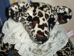 Bonjour tout le monde, je suis Gavotte, une grande ourse de 40 cm réalisée en peluche australienne à poils ras imitation panthère. J'aime bien ma collerette en dentelle.