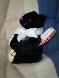 Coucou, je m'appelle Eclipse, je suis un mini ours de 12 cm tout mignon, réalisé en suédine noire. J'ai de beaux yeux violets.
