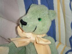 Bonjour tout le monde, je m'appelle Amande, je suis un gentil ours de 31 cm réalisé en Schulte mohair vert clair à poils ras.Mes yeux aussi sont verts, et j'ai mis un gros noeud beige.