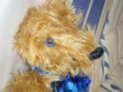 Bonjour, Je m'appelle Fripon, je suis un adorable ourson de 23 cm réalisé dans un superbe Schulte mohair blond bouclé.J'ai un long museau et les yeux bleus.