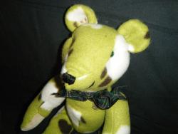Coucou, Moi, c'est Olive. Je suis un gentil ours tout doux et tout léger réalisé en tissu polaire vert imprimé. Je mesure 35 cm.
