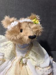 Coucou, je m'appelle Aliénor. je suis une adorable toute petite ourse de 16 cm réalisée en Schulte mohair. J'ai mis ma belle collerette en dentelle ancienne.