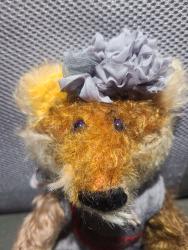 Coucou, je m'appelle Marielle. Je suis une gentille ourse de 25 cm réalisée en Schulte mohair de plein de tons de jaune et brun. J'ai mis ma petite robe grise, mon collier et mon petit chapeau.