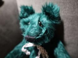 Bonjour, je m'appelle Jeannot. Je suis un très gentil ours de 27 cm réalisé en fausse fourrure d'un beau vert profond.