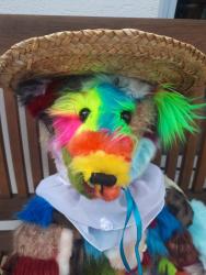 Bien le bonjour. Je me nomme Arabesque. je suis une grande ourse de 60 cm réalisée en patchwork de fausse fourrure et de mohair. Ma conception a demandé beaucoup de temps. J'ai mis un joli col et un chapeau de paille en prévision des premiers beaux jour.