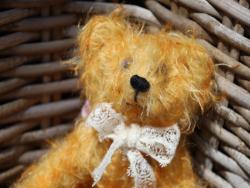 Bonjour, je m'appelle Justin. Je suis un petit ours tout mignon réalisé en Schulte mohair bouclé méché jaune et orange. Je mesure 18 cm.