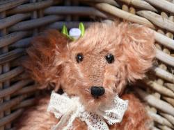 Bien le bonjour, je m'appelle Estelle, je suis une ourse de 23 cm réalisée en Schulte mohair beige et suédine rouge.