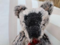 Coucou, je suis Pamphile, un beau grand ours de 55 cm réalisé dans une jolie fausse fourrure méchée à poils longs . Avez vous remarqué l'élégance de mon collier?