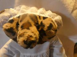 Bonjour, je m'appelle Amandine. je suis une toute jeune ourse de 48 cm, réalisée en fausse fourrure. J'ai mis un bandeau en dentelle et je porte une jolie brassière.