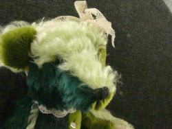 Bonjour, je m'appelle Fougère. Je suis une jolie ourse de 35 cm réalisée en Schulte mohair de différents tons de verts.