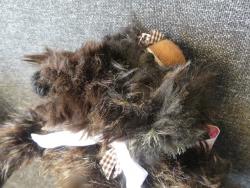 Bien le bonjour. Je me nomme Wolf, je suis un ours de 26 cm très poilu, réalisé en fausse fourrure. Difficile de trouver mes yeux dans tous ces poils... je suis lourd car mes pieds sont lestés. J'ai sorti mon petit chapeau et tous mes petits noeuds.