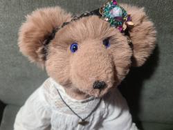 Bonjour, je m'appelle Hortense. Je suis une grande ourse de 38 cm réalisée en fausse fourrure toute douce. Je suis vêtue d'une magnifique robe ancienne pleine de dentelle.