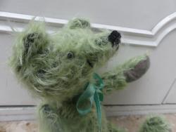 Bonjour, Je m'appelle Vegan. Je suis un bel ours de 30 cm réalisé en Schulte mohair bouclé vert. J'ai d'hypnotiques yeux transparents.