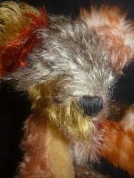 Coucou, je suis un joli ours de 20 cm réalisé avec plusieurs couleurs de Schulte mohair. J'ai mis un joli collier;
