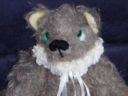 Bonjour tout le monde. Je m'appelle Décibel. Je suis un bel ours de 23 cm réalisé en Schulte mohair gris bouclé. Mes papattes sont en suédine blanche.