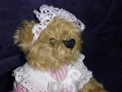 Coucou, je m'appelle Tania; je suis une petite ourse toute choupinette, je mesure 22 cm, je suis réalisée en Schulte mohair bouclé, je porte une jolie robe rose et un noeud en dentelle dans mes cheveux.