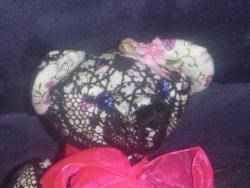 Salut tout le monde. Je m'appelle Guêpière, je suis une petite ourse de 22 cm réalisée dans un tissu fleuri recouvert de dentelle noire. J'ai les yeux bleus et un petit noeud dans les cheveux.